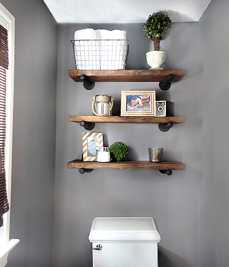 Have a look at this. Start with some slabs of wood (they don’t have to be pretty), and then some simple pipes, flanges, and caps. The real character of the shelves come out when you stain the wood, which is a relatively cheap and painless process.